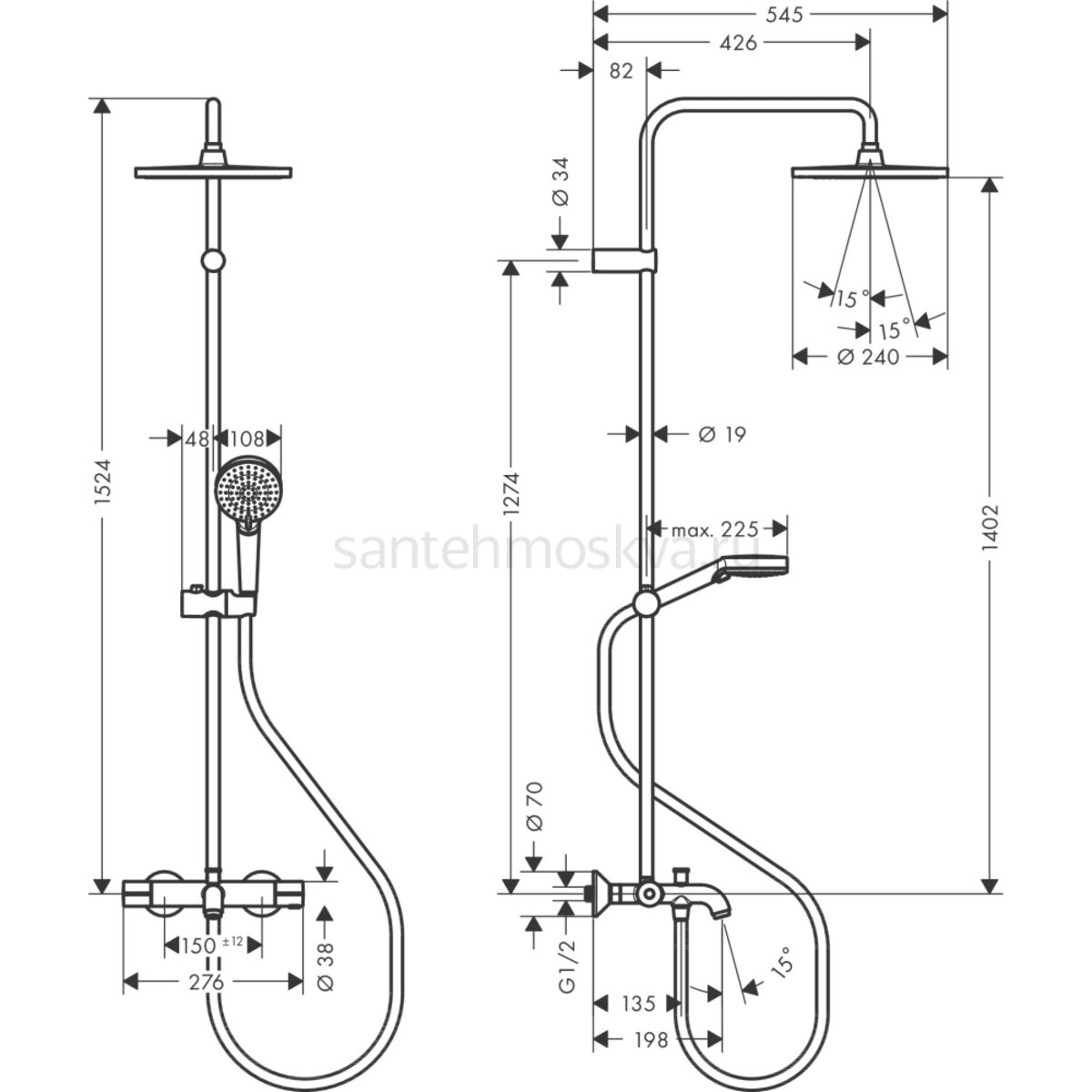 регулируемый по высоте держатель ручного душа, регулируемый угол наклона верхнего душа |
