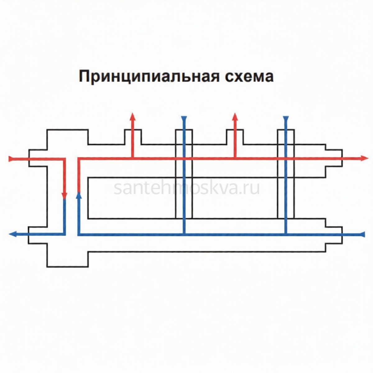 Конструкция позволяет разделить гидравлические потоки между котловым контуром и контурами потребителей, одновременно равномерно распределяя теплоноситель между тремя ветками отопления.