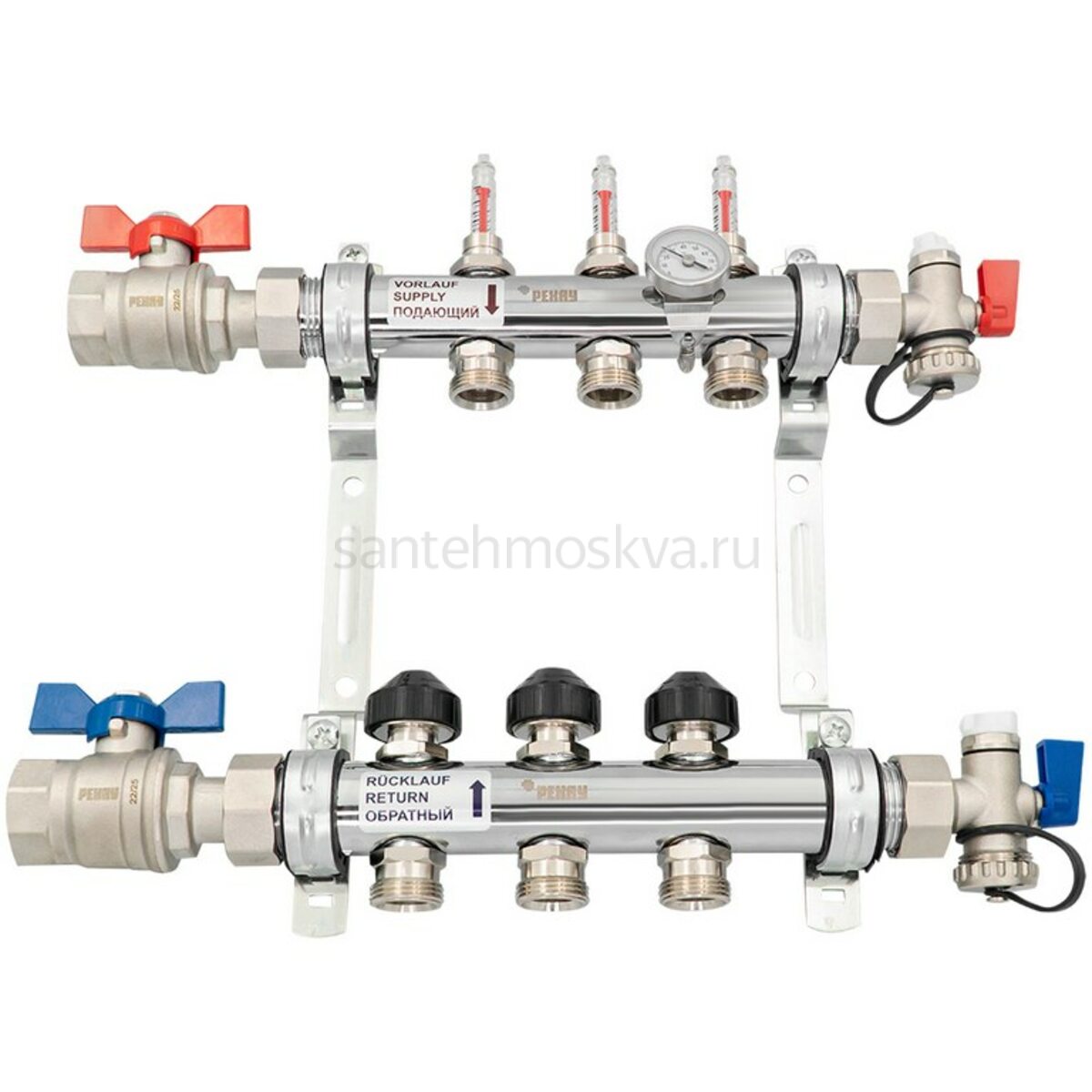 REHAU коллектор HKVD из нержавеющей стали (с расходомерами) включает в себя, 2 распределительные трубы 1" (наружная резьба), для подачи и отвод а теплоносителя с возможностью подключения с обеих сторон, смонтированы на звукоизолирующих оцинкованных кронштейнах соответствующих требованиям DIN 4109, с расходомерами на подающей трубе с запорными вентилями на обратной трубе, для подключения сервопривода резьба M 30 x 1.5, концевик коллектора с накидной гайкой 1" , уплотнительная прокладка, воздухоотводчик 3/8" и кран для заполнения 1/2", набор крепежных деталей, маркировочные таблички,