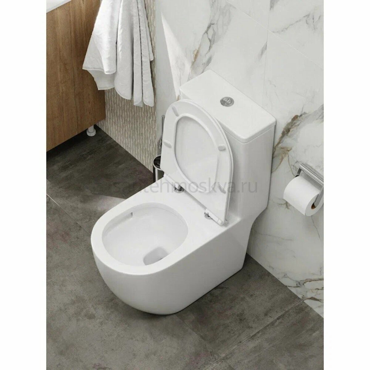 Унитаз выполнен из высококачественного санитарного фарфора, устойчивого к загрязнениям и механическим воздействиям. Безободковая конструкция исключает скрытые зоны скопления бактерий, что значительно упрощает уход и повышает гигиеничность.